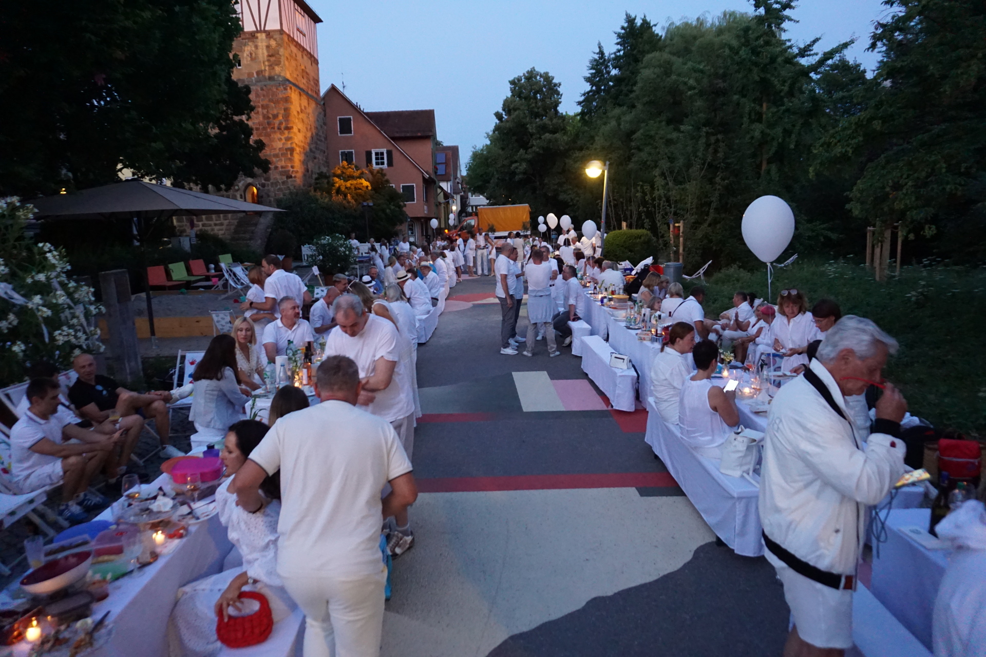 Die Stadt Weinsberg lädt ein, stellt weiß dekorierte Tische und Bänke zur Verfügung - die weiß gekleideten Gäste bringen ihr Essen, ihre Getränke und Geschirr selbst mit.