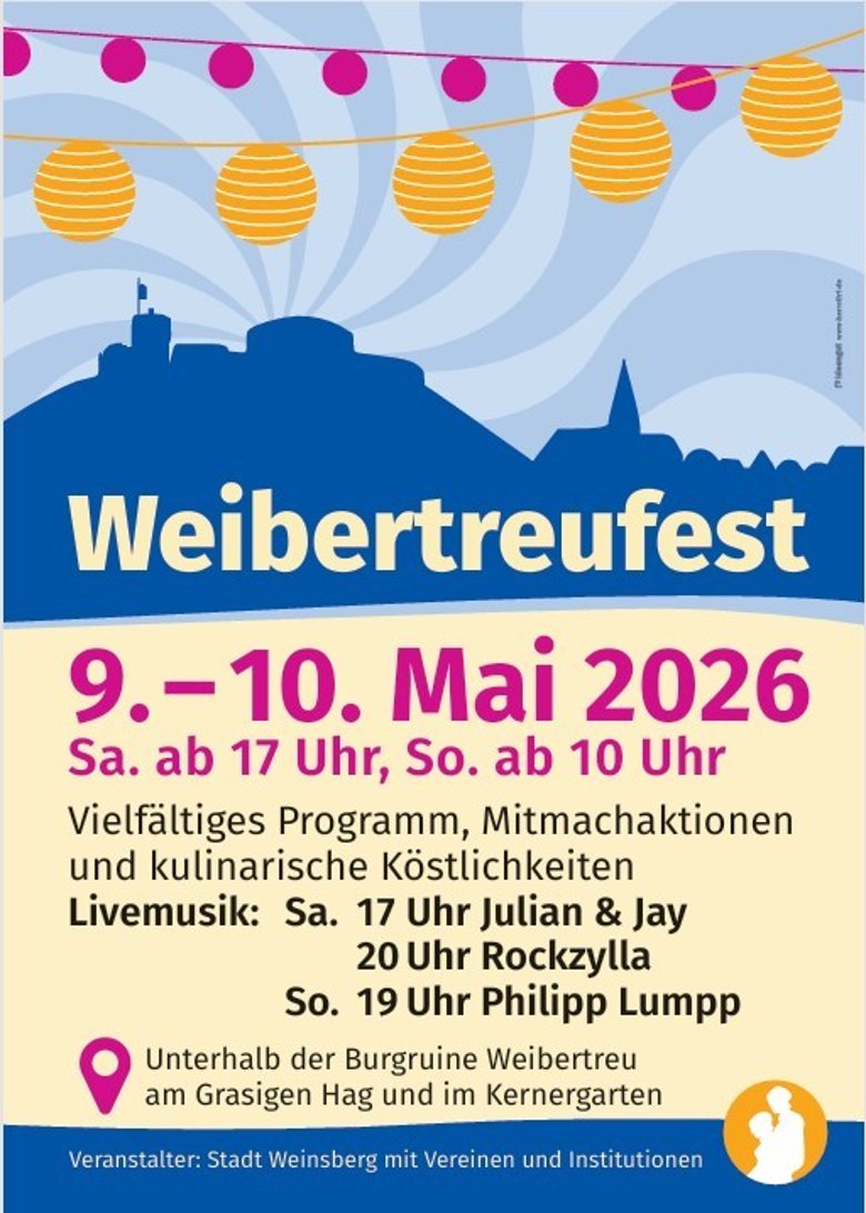 Auf der historischen Achse zwischen dem Kernerhaus und der Burgruine Weibertreu lässt sich das geschichtsträchtige Weinsberg, unter Beteiligung der ortsansässigen Vereine und Institutionen, bei vielfältiger Gastronomie, unterhaltendem Programm sowie musikalischer Begleitung erleben.