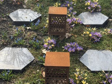 Die Grabpflege erfolgt durch die Stadt. Es ist also nicht gestattet, Aufbauten zu errichten, Grabschmuck oder Erinnerungsstücke niederzulegen, Kerzen oder Lampen aufzustellen, Pflegeeingriffe oder Anpflanzungen u.Ä. vorzunehmen. Ablagemöglichkeiten bestehen in den beiden Schalen rechts und links neben der Stele. Gerne können Kerzen in die Laternen gestellte werden.
