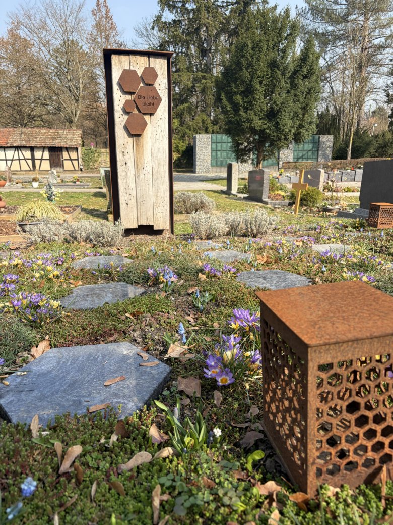 Die Grabpflege erfolgt durch die Stadt. Es ist also nicht gestattet, Aufbauten zu errichten, Grabschmuck oder Erinnerungsstücke niederzulegen, Kerzen oder Lampen aufzustellen, Pflegeeingriffe oder Anpflanzungen u.Ä. vorzunehmen. Ablagemöglichkeiten bestehen in den beiden Schalen rechts und links neben der Stele. Gerne können Kerzen in die Laternen gestellte werden.