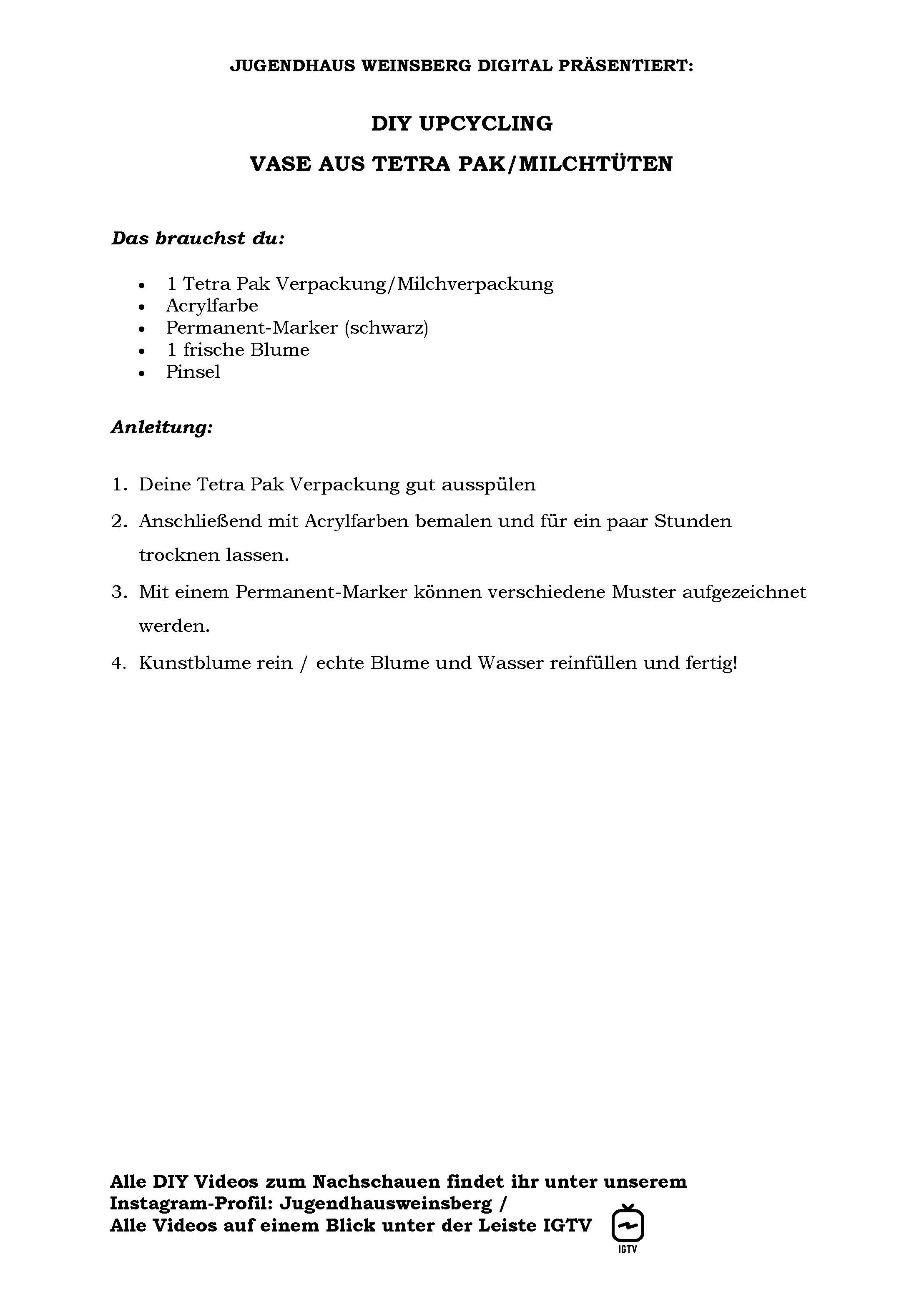 Wir bieten DIY Videos an, welche ihr auf unserer Instagram Seite @jugendhausweinsberg anschauen könnt. Um alles in Ruhe nachmachen zu können, habt ihr die Möglichkeit die Anleitungen und Etiketten auszudrucken.