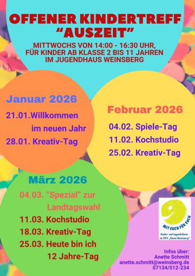 Der Offene Kindertreff "Auszeit" ist ein freiwilliges und kostenloses Angebot des GVV "Raum Weinsberg" für Kinder ab der 2. Klasse bis 11 Jahre. Die Kinder können mittwochs zwischen 14 Uhr und 16.30 Uhr das Jugendhaus Weinsberg ohne Anmeldung besuchen. Hier haben sie die Möglichkeit Freunde zu treffen, zu spielen und Freude zu haben. Dabei werden sie von einem Team aus hauptamtlichen und ehrenamtlichen Mitarbeitenden unterstützt. Die Kinder entscheiden selbst, was sie tun oder wann sie kommen und gehen möchten. Der Offene Kindertreff ist eine eltern- und jugendfreie Zone sowie inklusiv.