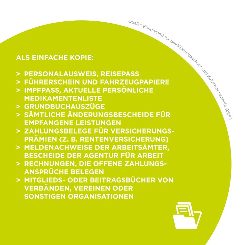 Es gibt viele denkbare Notsituationen, und je nachdem kann es eine längere Zeit dauern, bis es ein Zurück in die eigene Wohnung gibt. Für eine solche Situation sollten alle wichtigen Dokumente bereitliegen. Bloß welche? Und in welcher Form? Im Original sollten Familienurkunden griffbereit sein, zumindest als beglaubigte Kopie Sparbücher, Rentenbescheinigungen, Zeugnisse oder wichtige Verträge. Als einfache Kopie genügen etwa Führerschein, Impfpass oder Grundbuchauszüge. All dies sollte in einer Dokumentenmappe gesammelt werden und im Notfall auffindbar sein.