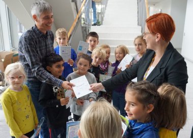 „Ich finde toll, dass man den Umschlag ausmalen kann“, sagte eine Zweitklässlerin bei der Feier. Andere erzählten selbstbewusst ins Mikrofon, dass sie es schön fanden, dass es Seiten zum Lesen gebe. Und auch der bunte Stadtplan mit den Spielplätzen fand eine Fangemeinde.