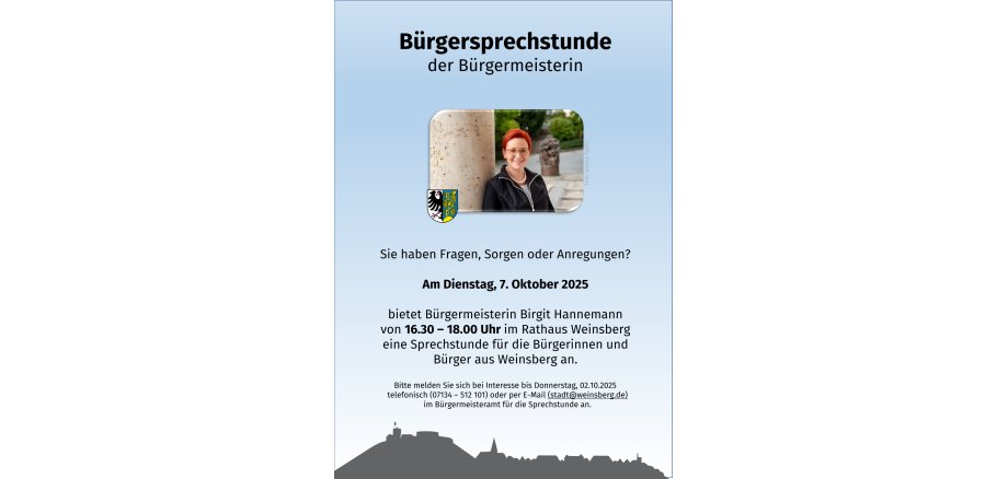 Bitte melden Sie sich bei Interesse bis Donnerstag, 02.10.2025 telefonisch (07134 – 512 101) oder per E-Mail (stadt@weinsberg.de) im Bürgermeisteramt für die Sprechstunde an.