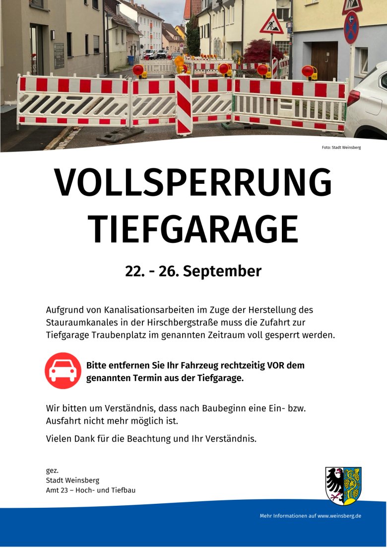 Im Rahmen des städtischen Starkregenrisikomanagements wurde insbesondere die Rückhaltung von Regenwasser zum Schutz vor Überflutung bei Starkregenereignissen empfohlen. Eine Maßnahme daraus ist die Herstellung des Stauraumkanals mit 375 m³ Volumen in der Hirschbergstraße zwischen der Ausfahrt der Tiefgarage Traubenplatz und dem Gebäude Hirschbergstraße 10. Die Ausführung erfolgt ab dem 1. September 2025 und die Arbeiten sollen - abhängig von der Witterung - voraussichtlich Ende Februar 2026 fertiggestellt werden. Für die Baustelleneinrichtung erfolgt bereits eine Vollsperrung der Hirschbergstraße ab dem 27. August 2025 bis zur Fertigstellung. Die Zufahrt zur Tiefgarage ist halbseitig mit einer Ampelsteuerung möglich. Im Zuge des Anschlusses der Tiefgaragenkanalisation an den Stauraumkanal ist eine Vollsperrung der Tiefgarage im Zeitraum vom 22.-26. September 2025 unvermeidlich.