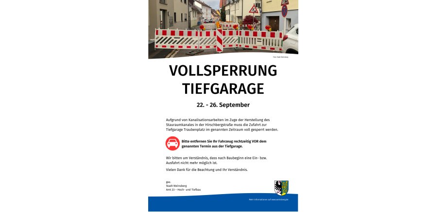 Im Rahmen des städtischen Starkregenrisikomanagements wurde insbesondere die Rückhaltung von Regenwasser zum Schutz vor Überflutung bei Starkregenereignissen empfohlen. Eine Maßnahme daraus ist die Herstellung des Stauraumkanals mit 375 m³ Volumen in der Hirschbergstraße zwischen der Ausfahrt der Tiefgarage Traubenplatz und dem Gebäude Hirschbergstraße 10. Die Ausführung erfolgt ab dem 1. September 2025 und die Arbeiten sollen - abhängig von der Witterung - voraussichtlich Ende Februar 2026 fertiggestellt werden. Für die Baustelleneinrichtung erfolgt bereits eine Vollsperrung der Hirschbergstraße ab dem 27. August 2025 bis zur Fertigstellung. Die Zufahrt zur Tiefgarage ist halbseitig mit einer Ampelsteuerung möglich. Im Zuge des Anschlusses der Tiefgaragenkanalisation an den Stauraumkanal ist eine Vollsperrung der Tiefgarage im Zeitraum vom 22.-26. September 2025 unvermeidlich.