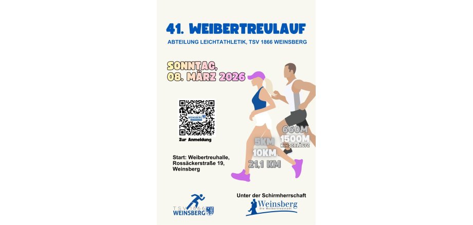 Der Weinsberger Weibertreulauf ist nach dem Winter der ideale Auftakt in die neue Laufsaison. Am Sonntag, 08. März 2026 können Sie auf den landschaftlich reizvollen Strecken in und um die Weibertreustadt Weinsberg ihre Fitness testen oder einfach nur die wunderschönen Strecken durch die Natur genießen. Dabei kann zwischen verschiedenen Distanzen (Halbmarathon, 10 km oder 5 km) gewählt werden. Die Strecken führen auf meist befestigten Wegen über Straßen und Wirtschaftswege durch Naherholungsgebiete, Weinberge und Wald. Und auch für alle Nachwuchsathleten kann zwischen zwei verschiedenen Strecken (660 m und 1500 m) gewählt werden. In die Schuhe, fertig, los…