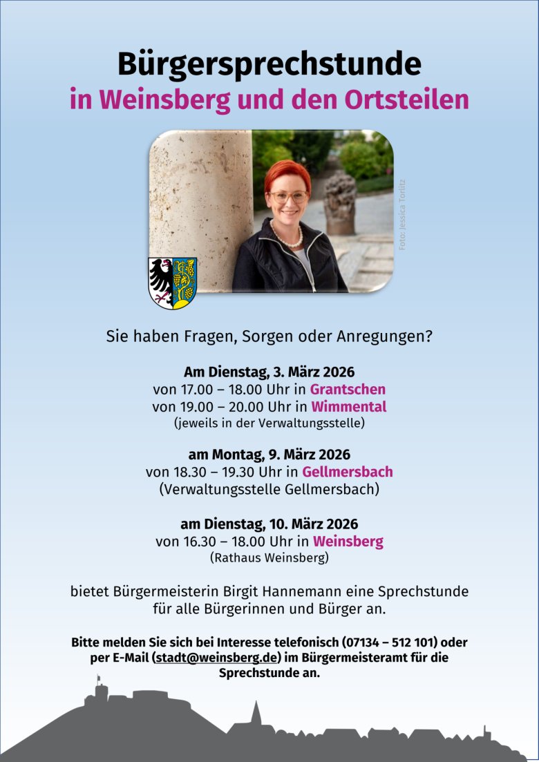 Bitte melden Sie sich bei Interesse telefonisch (07134 – 512 101) oder per E-Mail (stadt@weinsberg.de) im Bürgermeisteramt für die Sprechstunde an.