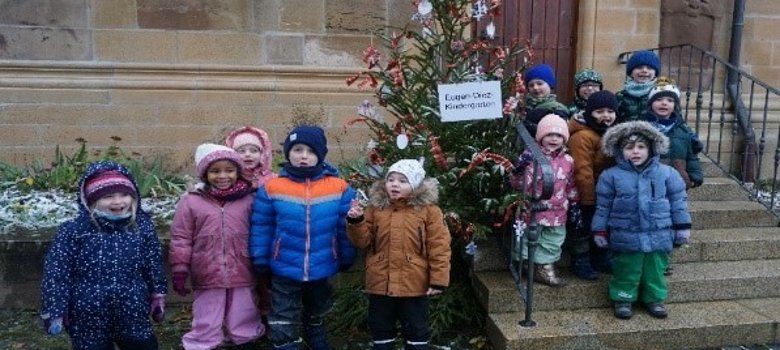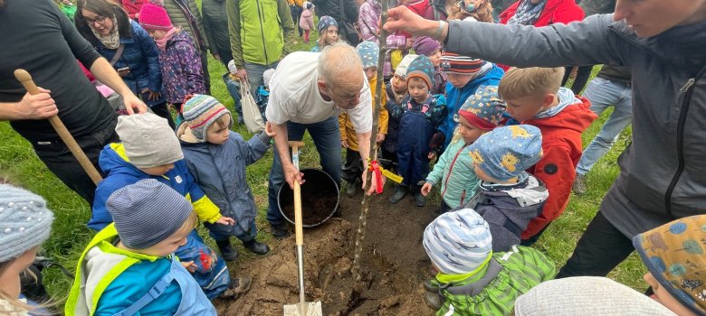 Gemeinsame Baumpflanzaktion der Kindertageseinrichtungen Walkindergarten, Kita „Heilbronner Fußweg“ und Kita „Am Grasigen Hag“.
