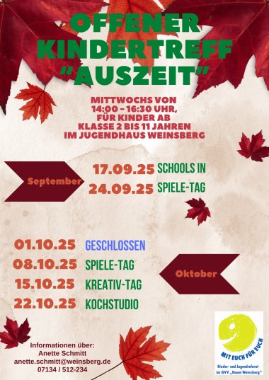Der Offene Kindertreff "Auszeit" ist ein freiwilliges und kostenloses Angebot des GVV "Raum Weinsberg" für Kinder ab der 2. Klasse bis 11 Jahre. Die Kinder können mittwochs zwischen 14 Uhr und 16.30 Uhr das Jugendhaus Weinsberg ohne Anmeldung besuchen. Hier haben sie die Möglichkeit Freunde zu treffen, zu spielen und Freude zu haben. Dabei werden sie von einem Team aus hauptamtlichen und ehrenamtlichen Mitarbeitenden unterstützt. Die Kinder entscheiden selbst, was sie tun oder wann sie kommen und gehen möchten. Der Offene Kindertreff ist eine eltern- und jugendfreie Zone sowie inklusiv.