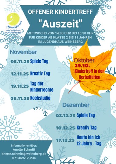 Der Offene Kindertreff "Auszeit" ist ein freiwilliges und kostenloses Angebot des GVV "Raum Weinsberg" für Kinder ab der 2. Klasse bis 11 Jahre. Die Kinder können mittwochs zwischen 14 Uhr und 16.30 Uhr das Jugendhaus Weinsberg ohne Anmeldung besuchen. Hier haben sie die Möglichkeit Freunde zu treffen, zu spielen und Freude zu haben. Dabei werden sie von einem Team aus hauptamtlichen und ehrenamtlichen Mitarbeitenden unterstützt. Die Kinder entscheiden selbst, was sie tun oder wann sie kommen und gehen möchten. Der Offene Kindertreff ist eine eltern- und jugendfreie Zone sowie inklusiv.