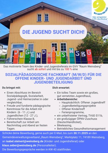 Schicke deine Bewerbung, gerne auch per E-Mail, bis zum 30.11.2025 an den Gemeindeverwaltungsverband „Raum Weinsberg“, Marktplatz 11, 74189 Weinsberg, an isabel.steinert@weinsberg.de (Kinder- und Jugendreferat) oder klaus.seber@weinsberg.de (Personalleiter).