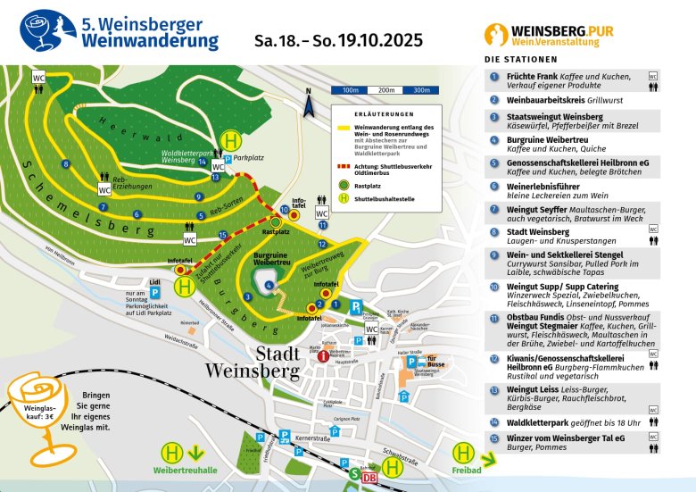 - Shuttlebus Haltestellen: Bahnhof, Weibertreuparkplatz, Freibadparkplatz, Aufgang von Heilbronner Straße, Kletterpark (Zufahrt Kletterpark gesperrt) den Shuttlebusfahrplan finden Sie hier ab September 2025
